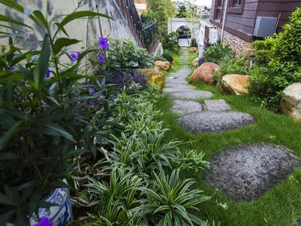 別墅花園前后院的通道上,青磚或青石板鋪就的道路,邊上冒出綠油油的小草,爬上可愛的青苔,小路外墻邊上種上幾株翠竹,綠色植物為主,其他色彩植物點(diǎn)綴,不失單調(diào)。遠(yuǎn)遠(yuǎn)望著,似幽幽叢林小路,阻隔著外面的繁雜喧嚷,帶著點(diǎn)點(diǎn)禪意。走在這一條小路上,內(nèi)心一定是平靜的。