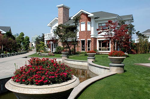 別墅花園設計在總體構思上宜根據(jù)當?shù)氐臍夂驐l件來考慮適當減少利用植物造景的比例,代之以四季不變的山石類造型、枯山水、金屬石材、雕塑置景色,使之在沒有自然色彩的冬季也保持著另一番美感。