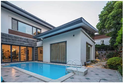 落地窗邊的水池是緊貼著墻面的,這次水池設(shè)計(jì)是一大亮點(diǎn)。白色建筑搭配藍(lán)色泳池,清爽大氣。與之搭配天藍(lán)色爬藤架,提升了整個(gè)空間的格調(diào)。