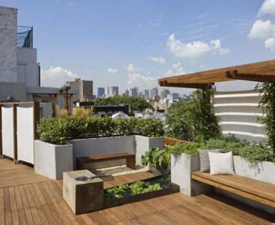 屋頂花園基本上很少設(shè)置頂部遮蔽處,作為人們的休憩之地,若是遇到陰雨天或者陽光強烈之時,屋頂花園則避無可避。所以在屋頂花園設(shè)計之中總少不了對于遮蔽場所的設(shè)置。在一些屋頂花園設(shè)置中,常常以延伸出木質(zhì)屋檐,作為屋頂花園的遮蔽場所。在屋檐之下,增設(shè)臺階,以木鋪設(shè),形成與屋頂花園即分離又融合的景觀。若是無需如此強烈的設(shè)計感,那么也可以在屋頂庭院設(shè)置一處獨立處,搭設(shè)大陽傘作為休憩遮蔽處。