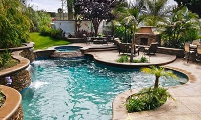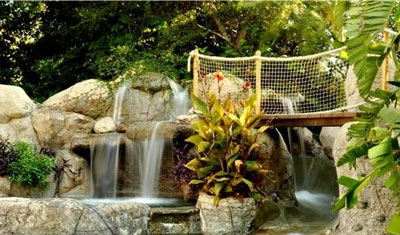 游泳池是熱帶景觀(guān)中常會(huì)有的設(shè)備,造型多樣,自然造型的如同在熱帶雨林或叢林中偶然發(fā)現(xiàn)的水池,而實(shí)際上這種游泳池是用人造巖石建成,有時(shí)花園里還會(huì)有精巧的疊石理水:瀑布、跳巖、水滑道等。游泳池的內(nèi)部常用色彩明亮的石材鋪裝,可以加強(qiáng)整個(gè)庭院的色彩表現(xiàn)。